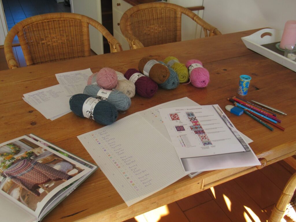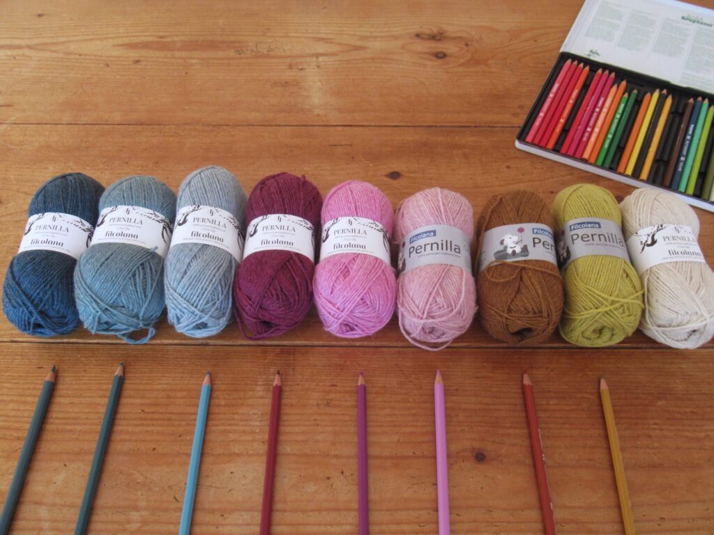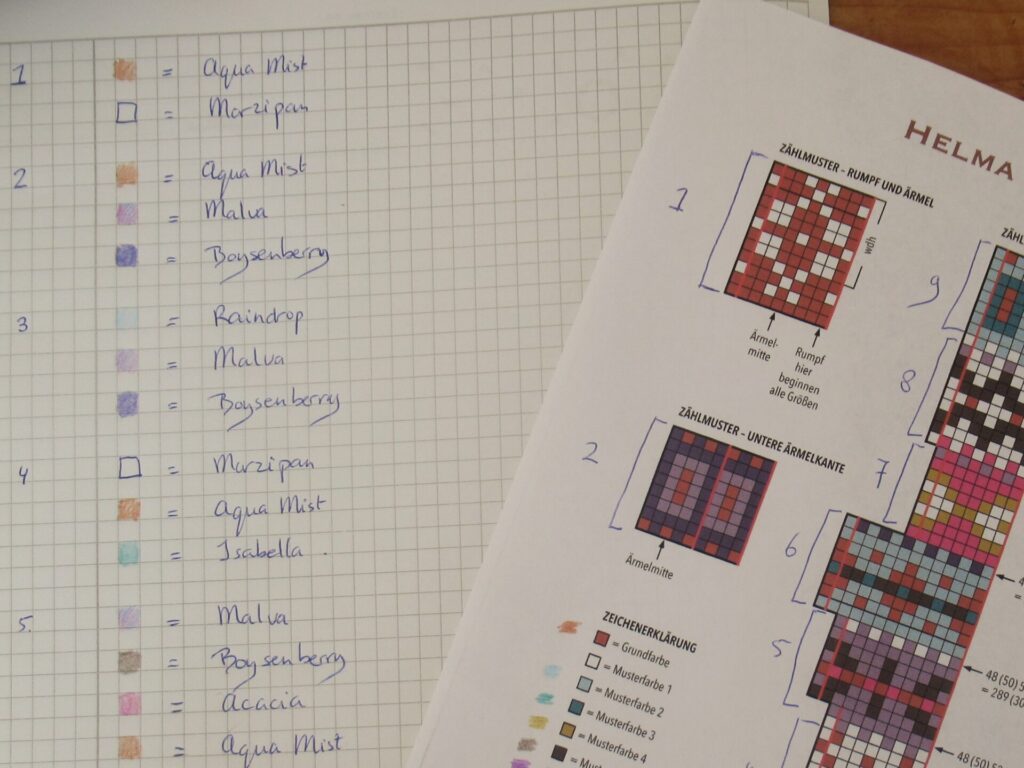 Before I even started knitting swatches, I looked closely at the pattern’s colourwork charts to decide which of the designer’s colours I could replace with which of mine. I got out some coloured pencils in order to try things out on paper first.