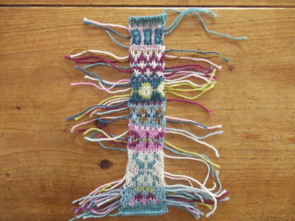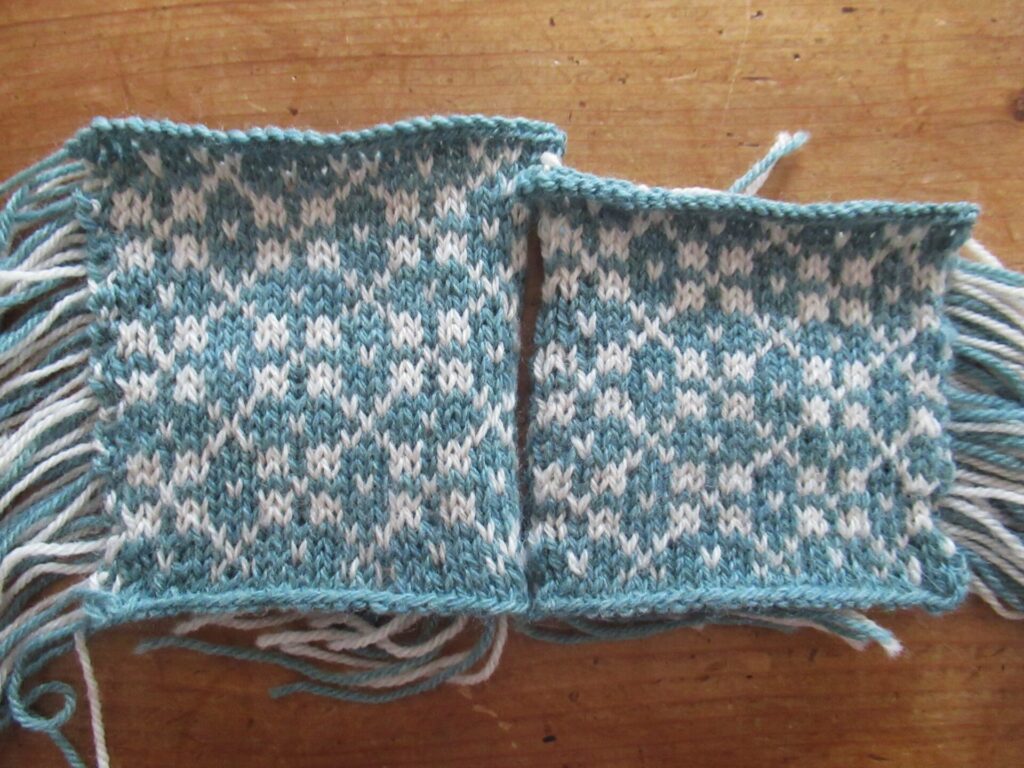 Reasonably but not entirely happy with the colour distribution, I knit a couple of even stingier swatches for one section (bottom of swatch above).