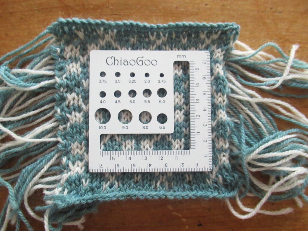 I do not mind swatching, but do not love it either and prefer not to make my swatches too large. In this case my swatch ended up smaller than the standard 10×10 cm/4×4”. As it happened, a dear knitting friend came for a visit last Friday and gifted me just the right tool for measuring small swatches (photo above). Thank you, L, it comes in very handy!
