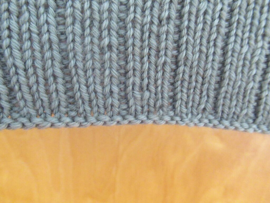 So, what I did was make a flat swatch knitting every row. This means starting every row on the right-hand side, breaking off the yarn at the end of each row and sliding the stitches back to the right needle tip. For me, the gauge of a flat swatch knit this way is similar to large circumference knitting in the round.