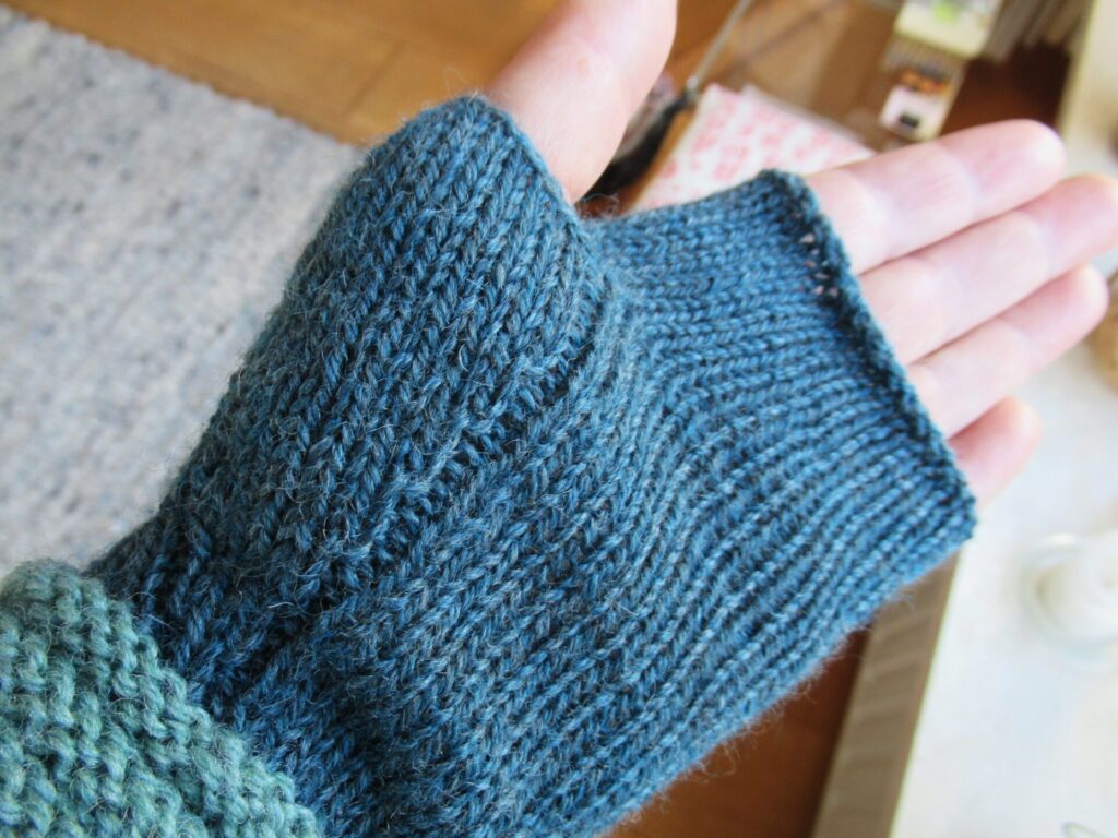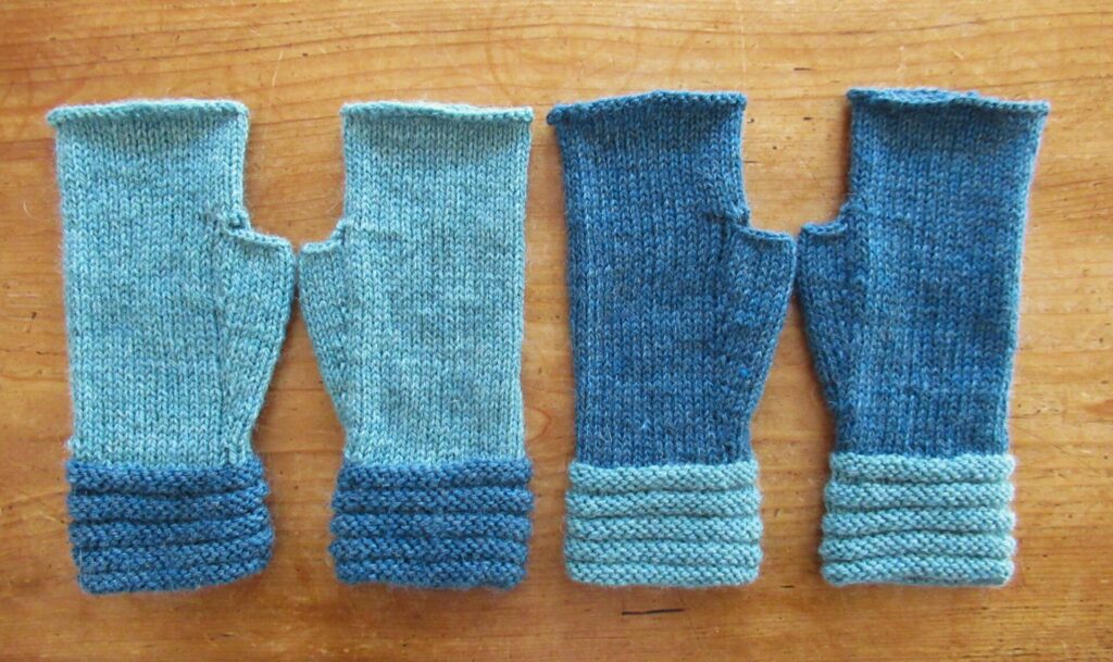 These Welted Fingerless Gloves are some of my favourite things to knit for gifts and I’ve knit many pairs over the years. The yarn I’ve used this time is Filcolana’s ‘Pernilla’ in shades Storm Blue and Aqua Mist. The picture below captures the colours better.