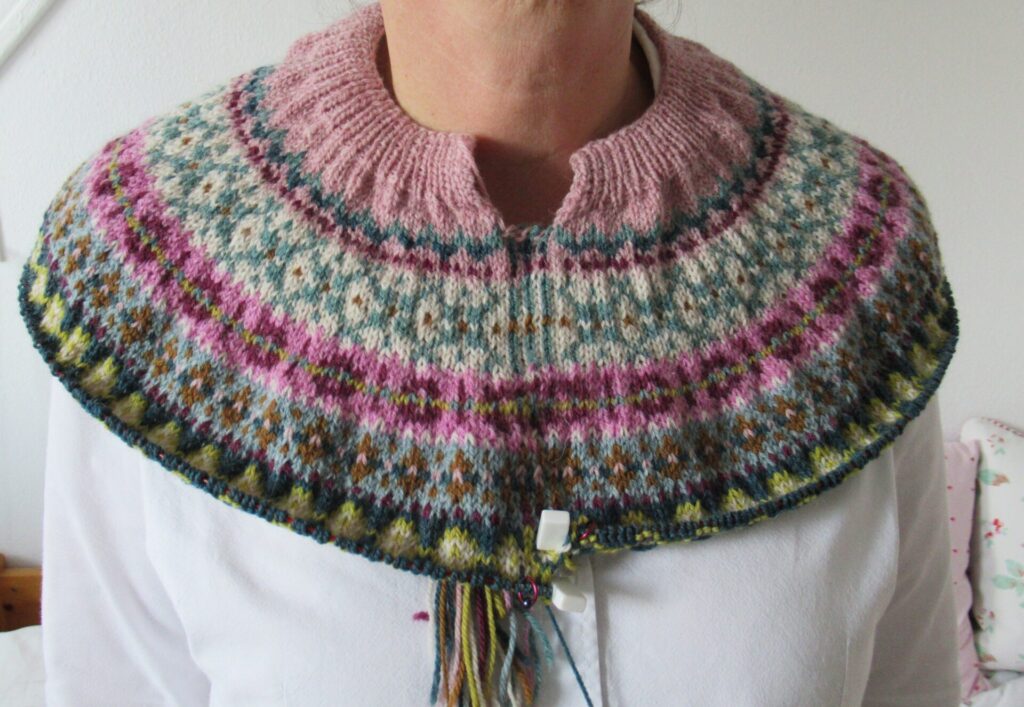 The yoke for my Helma cardigan has grown, too, and while knitting I began to wonder if it was becoming too wide. Placing half of the stitches on a spare cord, I tried it on. There is quite a bit of ease around the shoulders, but I think it looks okay. Not quite sure though. According to the pattern I need to increase more stitches further on. Hmmm…
